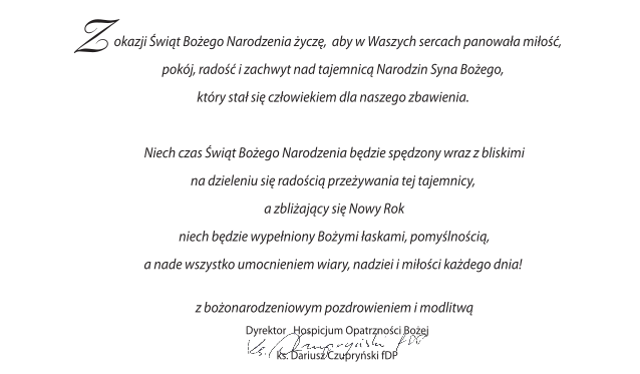 W kaplicy Hospicjum pod przewodnictwem ks. Dyrektora Dariusza Czupryńskiego została odprawiona Msza św. z udziałem naszych pacjentów, ich rodzin przy licznie obecnych i czynnie zaangażowanych w pomoc wolontariuszy i pracowników.