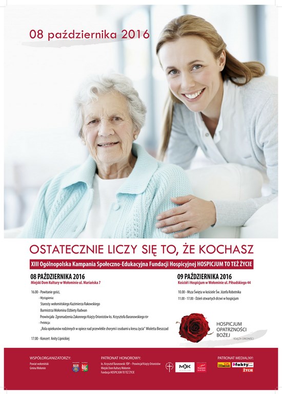 Zapraszamy na XIII Ogólnopolską Kampanię Społeczno-Edukacyjną Fundacji Hospicyjnej - HOSPICJUM TO TEŻ ŻYCIE. Współorganizatorami wydarzenia są: Gmina Wołomin, Powiat Wołomiński.