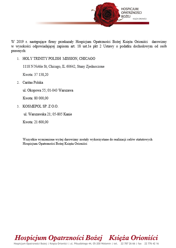 Przekazanie darowizny pieniężnej na konto bankowe HOSPICJUM OPATRZNOŚCI BOŻEJ KSIĘŻA ORIONIŚCI w ramach odliczenia 10% dochodu, wykazując darowiznę w zeznaniu CIT