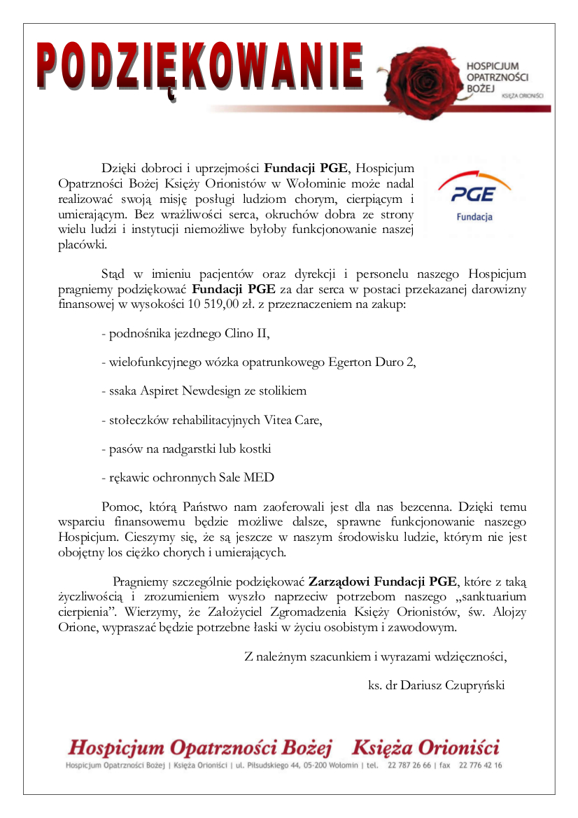 Decyzją Zarządu Fundacji PGE 10/1/VI/2018 z dnia 20.06.2018 została przyznana na rzecz Hospicjum Opatrzności Bożej Księża Orioniści darowizna w kwocie 10 519,00 z przeznaczeniem na zakup: