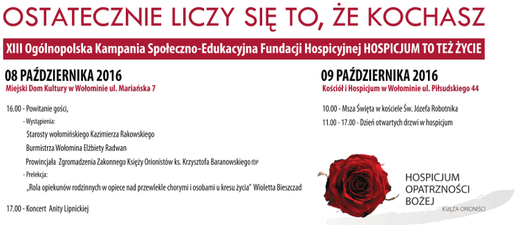 Zapraszamy na XIII Ogólnopolską Kampanię Społeczno-Edukacyjną Fundacji Hospicyjnej - HOSPICJUM TO TEŻ ŻYCIE. Współorganizatorami wydarzenia są: Gmina Wołomin, Powiat Wołomiński.