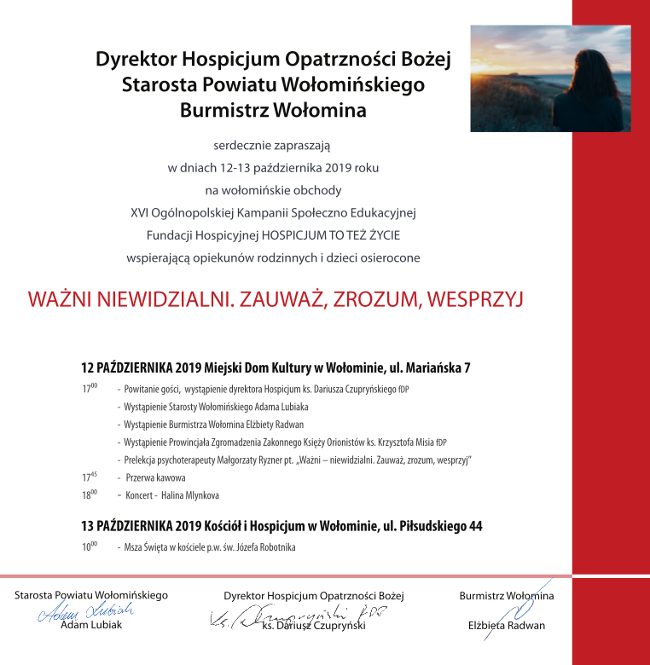 Zapraszamy na XVI Ogólnopolską Kampanię Społeczno-Edukacyjną Fundacji Hospicyjnej HOSPICJUM TO TEŻ ŻYCIE. Współorganizatorami wydarzenia są: Gmina Wołomin, Powiat Wołomiński. Zapraszamy w dniach 12-13 października 2019 r.: