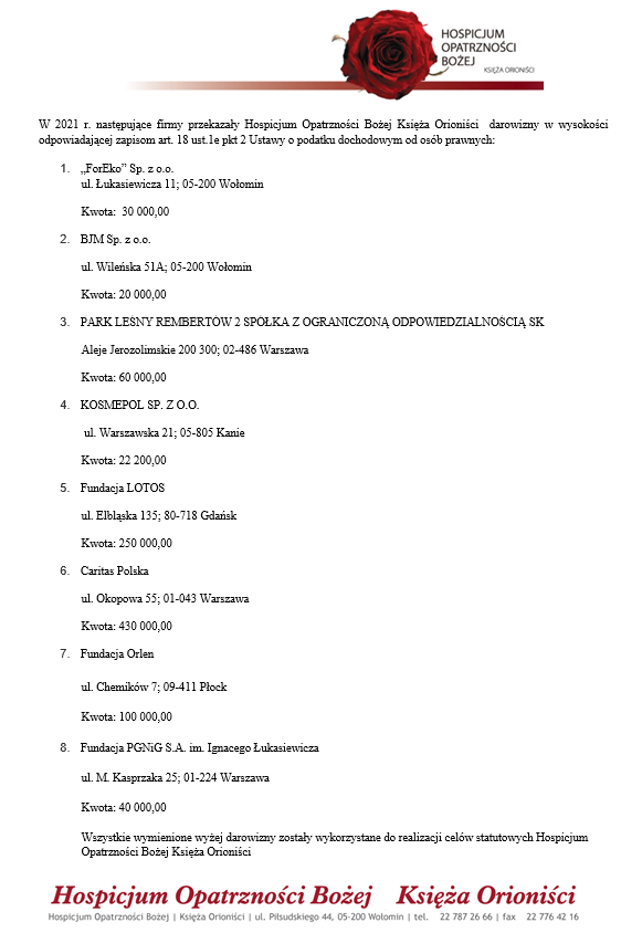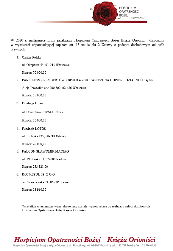 Przekazanie darowizny pieniężnej na konto bankowe HOSPICJUM OPATRZNOŚCI BOŻEJ KSIĘŻA ORIONIŚCI w ramach odliczenia 10% dochodu, wykazując darowiznę w zeznaniu CIT